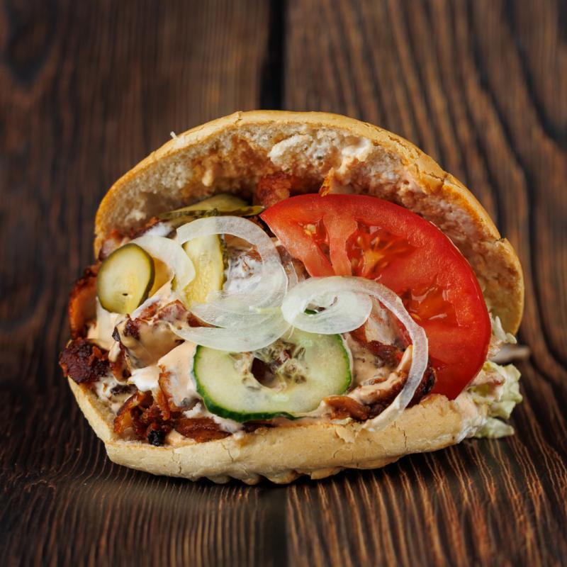 150g mięsa /kapusta pekińska /ogórek/ogórek konserwowy /pomidor /cebula/sos kebabowy/serek panierowany /bacon /cebulka prażona