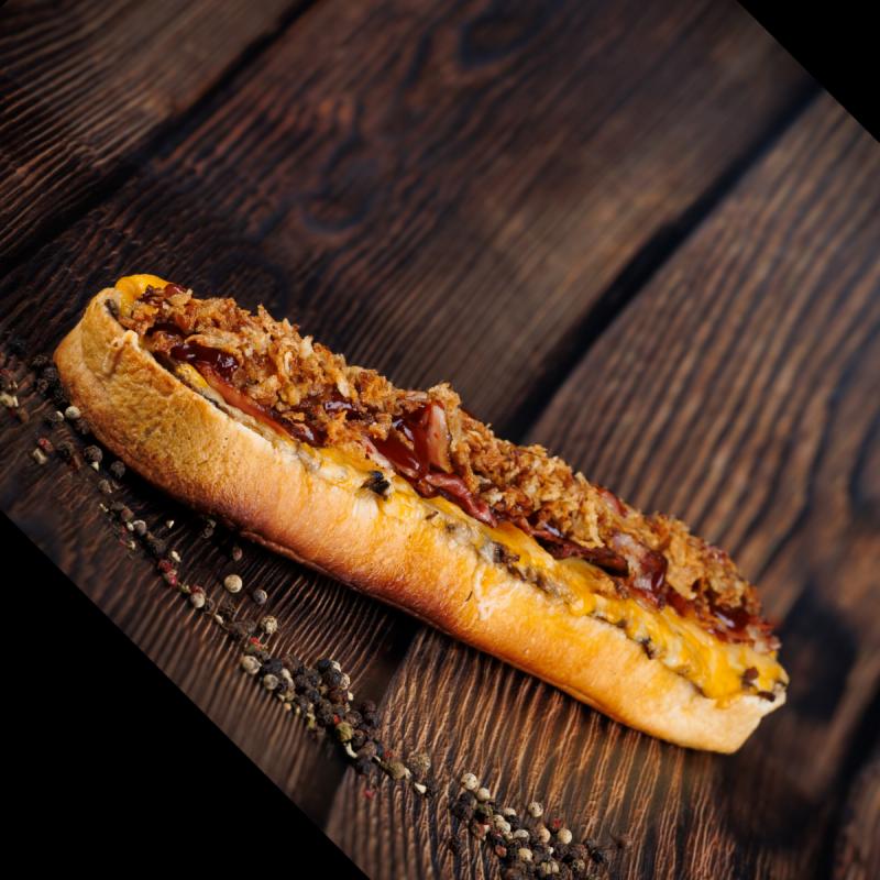 36cm bagietka/ farsz pieczarkowy/100g wołowina/ser cheddar/ser cheddar red /cebula prazona / sos
